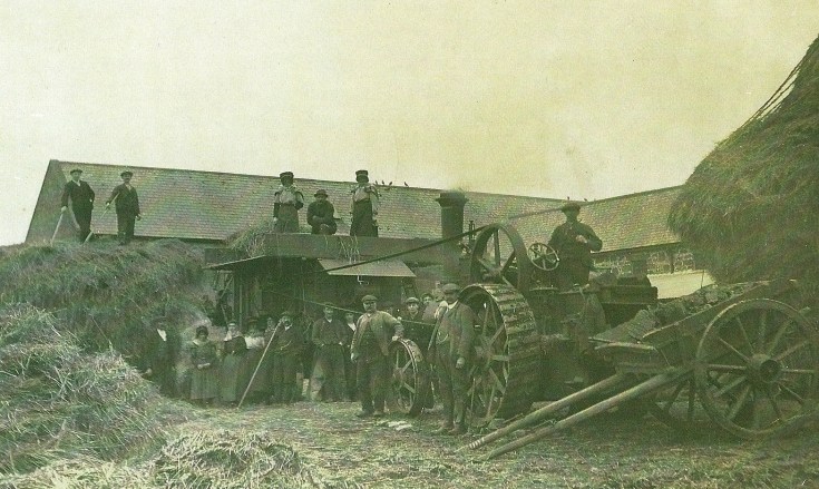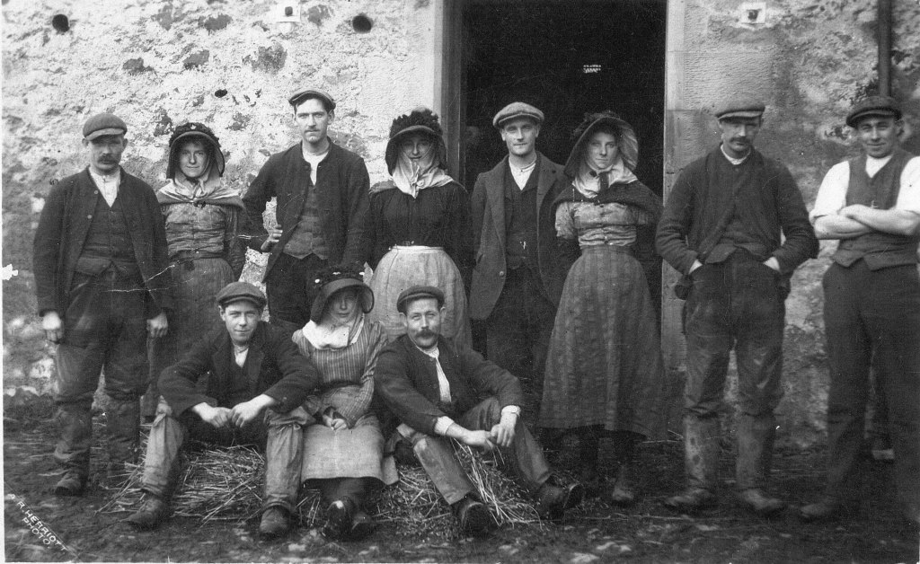 Farm workers in Berwickshire, assembled in the farmyard at Whitsome Laws. A Waddle, Betty McLain’s father, standing far right. J Waddle, Betty’s grandfather, standing at the far left. Robert White, Betty’s maternal grandfather, seated at the front on the right (Photograph – Mrs Betty McLain)